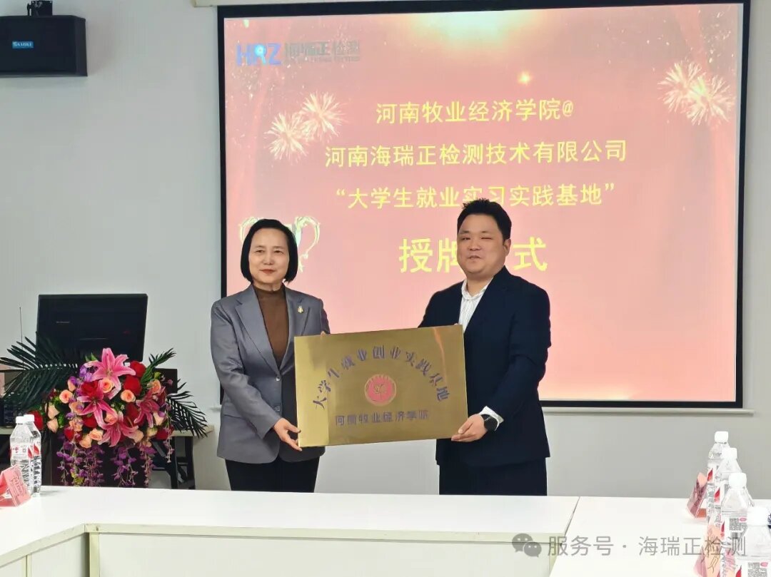 為進一步推動合作落地,尹新明校長代表學(xué)校向海瑞正檢測授予“大學(xué)生就業(yè)實習(xí)實踐基地”和“百名專家助百企工程服務(wù)基地”牌匾。